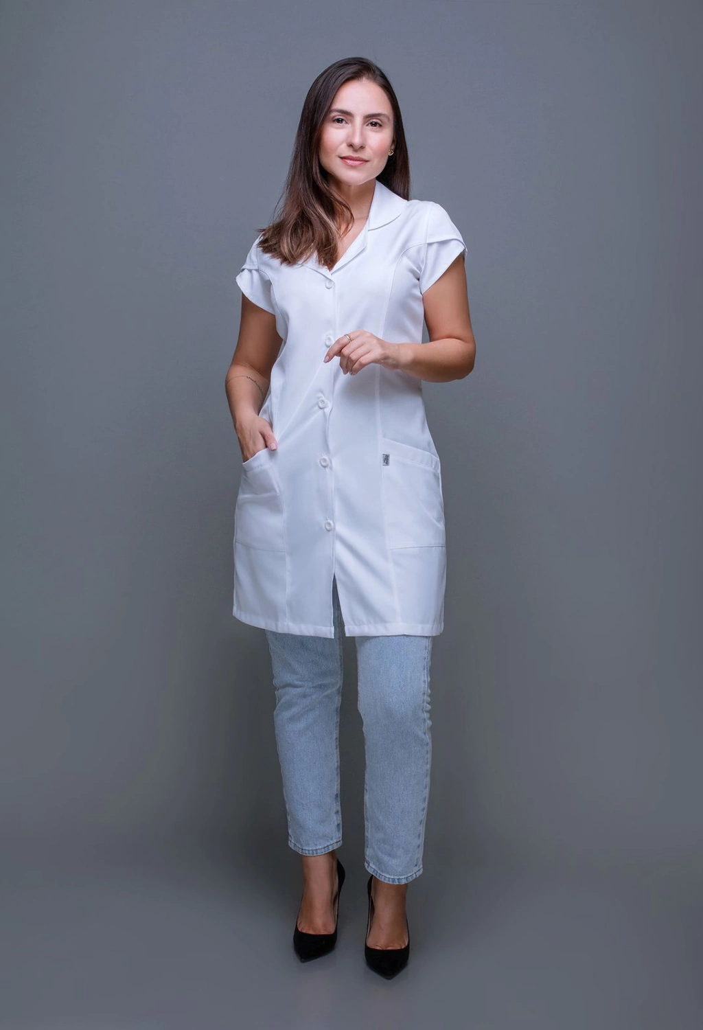 O Tulipa vem com uma manga curta com recortes, dando um charme todo especial no jaleco, o fechamento com botões aparentes, gola tradicional arredondada, mas com uma modelagem bem feminina, possui dois bolsos laterais.